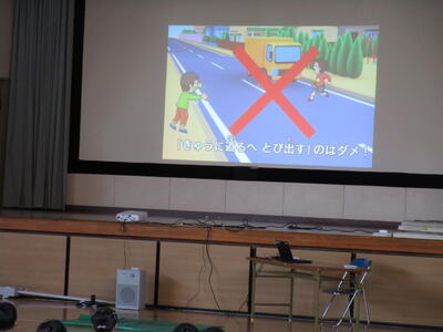 今朝、保護者の方が「カバンにカバーがついていたので、多分1年生の児童だと思われますが、保健センターの前の道路を飛び出して、車にクラクションを鳴らされていて危なかったので、学校に伝えに来ました。」ということがありました。タイミングよく、今日は、1年生が交通安全教室があったので、道路の歩き方、飛び出しはしない、横断歩道を渡るなどのルールの確認や実際に横断歩道の渡り方を、全員が確認しました。