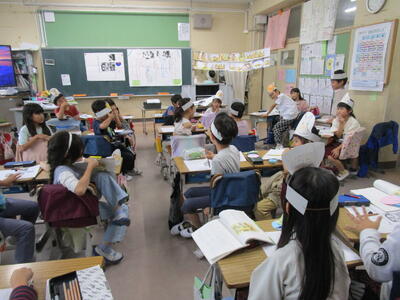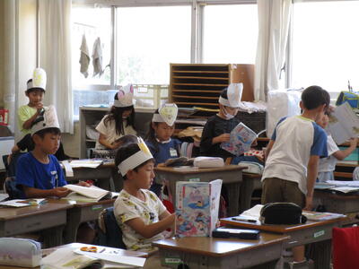 2年生、国語「きつねのおきゃくさま」で、キツネになりきって、音読練習をしていました。みんな、自分の作ったお面を嬉しそうにつけて読んでいました。また、隣のクラスでは、音楽で「かっこう」を練習していました。