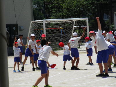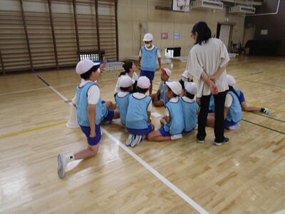 4年生、体育館で3人1チーム、8チームでプレルボールの試合をやっていました。3分で相手を変えて、いろいろなチームと対戦していました。最初の頃より、かなり上達して、一人一人の子がボールに触れる回数も多く、楽しく取り組んでいました。