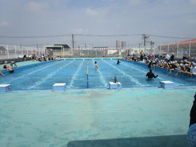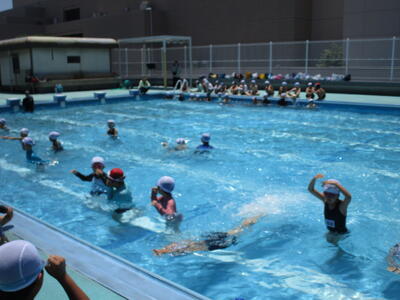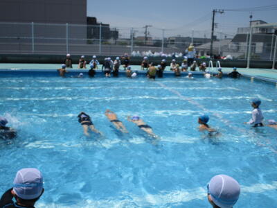1年生、学校で初めてのプールです。地域の方3名がお手伝いしてくださり、担任3人と合わせて6人で子供たちを見ていました。子供たちもとても楽しそうに活動していました。2年生も、今年度、初めてのプールでした。昨年度の1年生の時に比べると、水に顔をつけられる子がすごくたくさん増えていました。流れるプールも大喜びでやっている子がたくさんいました。