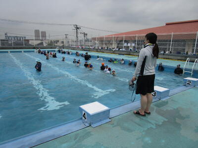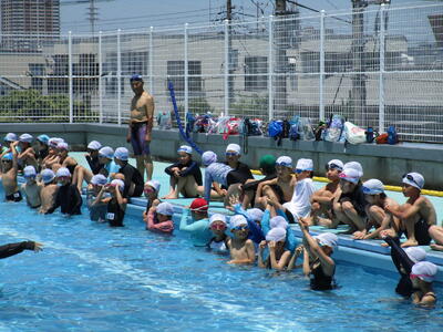 3年生、水泳で地域のメガロスの方が指導に来てくれました。全体指導の時も水中に入り指示を出し、水慣れが楽しくできました。指導の仕方もとてもわかりやすかったです。