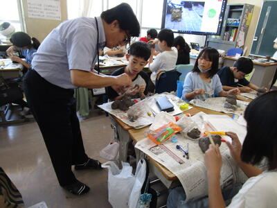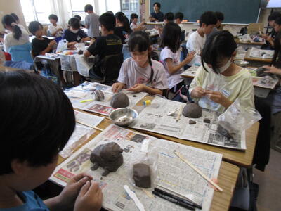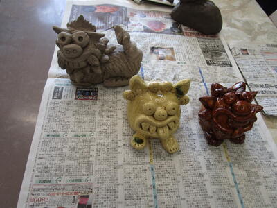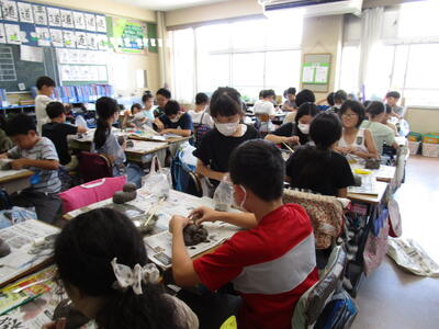 5年生、陶芸の先生が来校して、各教室でシーサーを作っていました。粘土のくっつけ方を個別に助言していました。