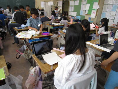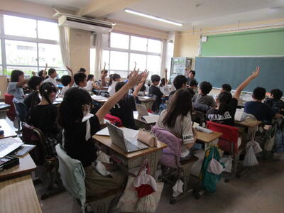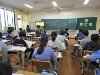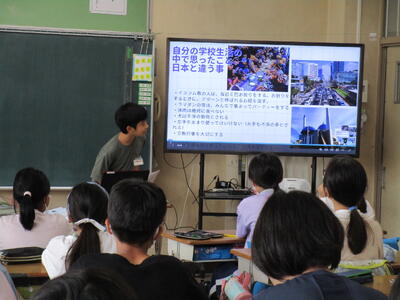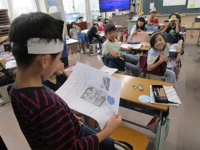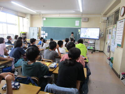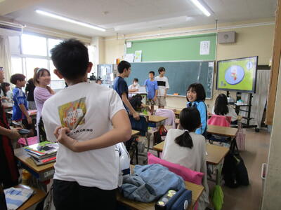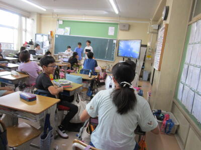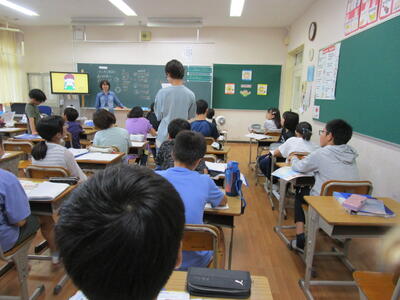 6年生、朝の会で、チーム対抗でクイズを出したり、学校の謎を皆に伝えたりして盛り上がっていました。隣のクラスでは、インドネシアから体験入学にきている子供が、画像を使って、インドネシアの学校の様子や日本との文化や宗教の違いをわかりやすく説明していました。「1年中、暖かいので、プールの授業が週2回あります」の部分には、聞いている子供たちから「いいな!」という声が聞こえてきました。