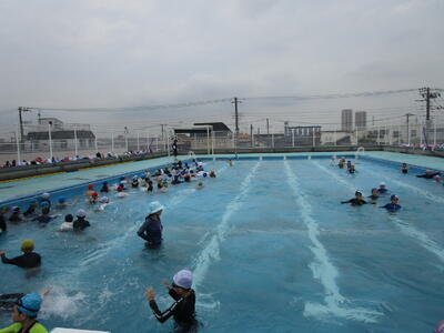6年生、先週プール開きをしたので、今日は早速、プールサイドに腰かけての水のかけっこやバタ足、水中じゃんけんなど水慣れをしていました。地域のボランティアの方2名も、皆が安全で楽しく水泳学習ができるように一緒にお手伝いをしていました。6年生、元気いっぱいです。