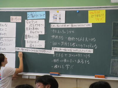 3年生、道徳の授業を担任が交換して、別のクラスでやっています。4クラスあるので、一人の先生が同じ教材を4回授業しますが、クラスによって反応が違ったり、出てくる意見も違ったりします。
