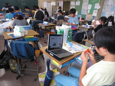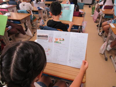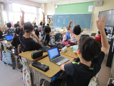 5年生、算数の授業で、何倍かを考えて解く問題をやっていました。多くの子供たちが積極的に手を挙げていました。隣のクラスでは、総合的な学習の時間で、「千葉の魅力を伝えよう」をテーマにグループに分かれて、学習を進めていました。ここでも、多くの児童が挙手をして、積極的に授業に参加していました。