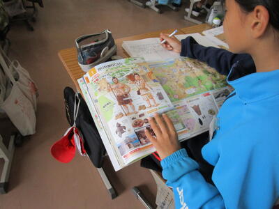 6年生、社会の学習で、縄文時代と弥生時代の資料を見て「衣・食・住」の観点で比べて、まずは、一人で書き出していました。子どものノートを見ると、様々な気づきがあり、資料を読み取る力がついているのがわかりました。