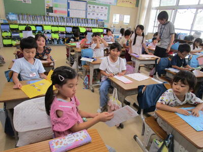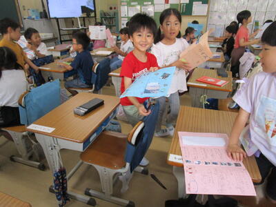 1年生、6年生のペアのお兄さん、お姉さんが作った学校紹介のリーフレットを、朝の時間にプレゼントしてくれました。一人ずつ内容が違っていて、先生紹介や学校の不思議など・・・、写真や絵を使ってわかりやすく作られていました。1年生の子供たち、とても喜んでいました。