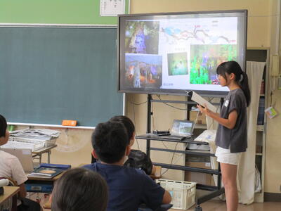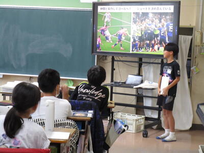 5年生、国語「すいせんしよう『町じまん』」の学習から、町ではなく、自分が自慢したいものを1枚のスライドを作成して紹介していました。親戚自慢や友達自慢、自分自慢などとてもわかりやすく皆に伝えていました。