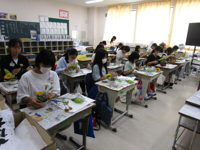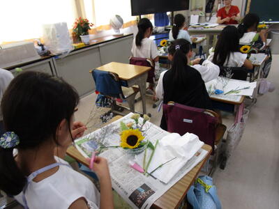 5校時終了後、4年生以上はクラブ活動がありました。今年度できた「お花クラブ」では、届いたお花を自分で切ってオアシスに活けています。器はそれぞれ家から持参してきました。今日のメインのお花はひまわりでしたが、同じお花でも活け方や器で、どの作品も違って見えます。