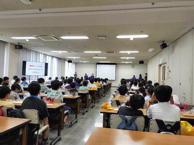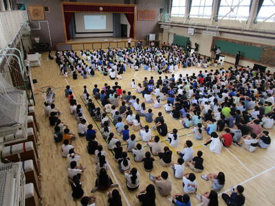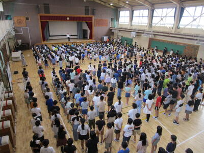 体育館で、全校児童が集まって夏休みを迎える会を行いました。校歌の場面では、高学年がアルトを歌い、全校で美しいハーモニーとなりました。その後、校長先生からは、七夕クイズの後に、願い事をかなえるために、自分を振り返り、夏休みや9月から目標をたてて行動しようという話がありました。その後、生徒指導の先生と代表委員の児童から夏休みの生活についての注意点について話がありました。最後に表彰児童が、全校に紹介され、皆から拍手を受けました。