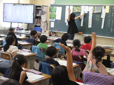 5年生、実習生の先生が算数で分数の大きさを比べる授業をやっていました。最初の問いに子供たち、とても積極的に手をあげています。