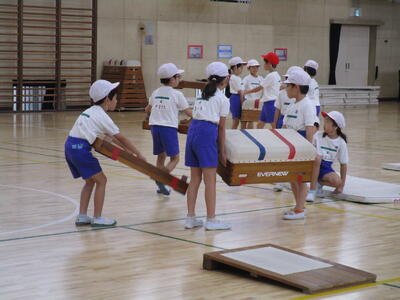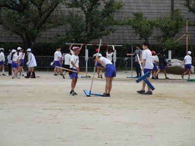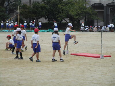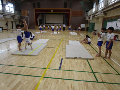 今年度から、体育のまとめどりを始めたため、今日は体育館で2年生が跳び箱、校庭では3年生と6年生が高跳び、4年生が走り幅跳びをやっています。どの学年の児童も練習はもちろん、準備や片付けも一生懸命に取り組んでいました。
