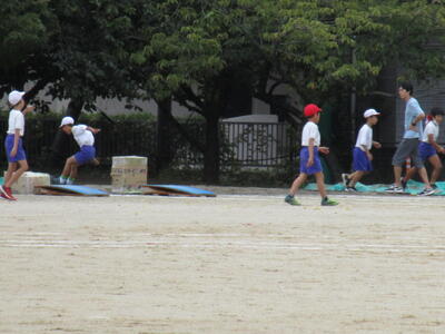 陸上部の児童が朝練をしていました。短距離走・走り幅跳び・高跳びと、種目ごとに分かれて練習をしていました。
