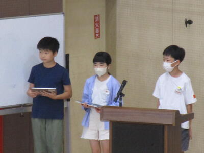 前期の終業式がありました。全校で2部合唱で校歌を歌いました。その後、校長先生が代表の6年生児童に通知表を渡しました。その後の校長先生の話では、よい心と悪い心について考えるために、アンパンマンとバイキンマンに例えて、話がありました。よい心が悪い心に勝ち、よい行動をすることをふやしていきましょう、また、悪い行動を叱ってくれる人に感謝しましょうという内容でした。その後、表彰、6年生が作成した大和田小の紹介、代表委員会のあいさつ運動の話がありました。