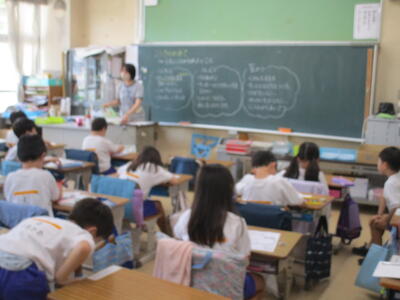 4年生、国語で、2年生と一緒に楽しめる新スポーツを考え話し合いました。2年生の教室で、日時とやる内容を伝えていました。2年生もとても楽しみにしています。