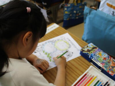4年生、自分の好きなお話の世界を紙粘土で作って表現しています。先生がお手本で作ったのは「きつねのおきゃくさま」です。子供たちに聞くと「銀河鉄道の夜」や竜の出てくる話など、それぞれの子が設計図をもとに粘土をこねていました。