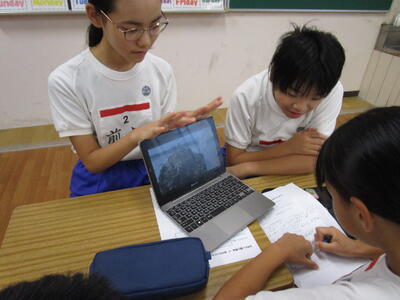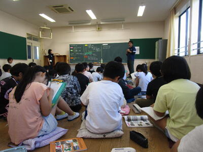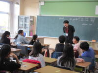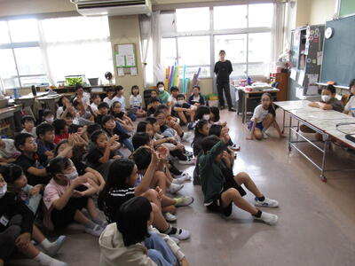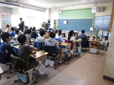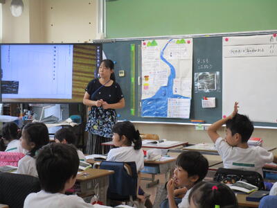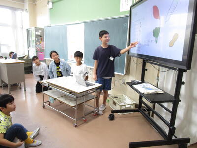 3年生、3組の先生が4組で理科の学習を進め、4組の先生が3組で社会を進めていました。どちらの授業も、画像を使いわかりやすい授業でした。