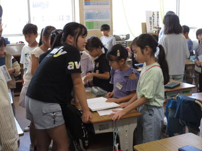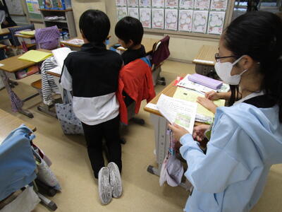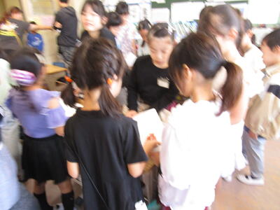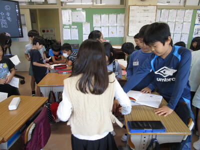 1.6年生も朝学習の時間に交流活動をしていました。1年生が国語の学習でつくった「いきものクイズ」をペアの6年生に出題したあとに、クイズブックをプレゼントしていました。教室にいた6年生、振り返りを全体でしていたクラスもあり、「すごくしっかりとクイズができていた」「難しいクイズでわからなっかった」と内容も充実していたことがわかりました。
