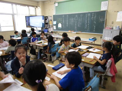 1年生、算数で水のかさの学習をしているクラス。図工でパクパクさんを作ろうとしているクラス。国語で問いと答えの文を学習しているクラス。どのクラスも落ち着いて学習に取り組んでいました。