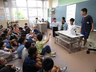 5年生が総合的な学習で千葉県のことを調べ、朝学習の時間を使って、3年生に発表していました。説明キャラクターをペープサートにしたり、クイズを出したりしながら、千葉県の地形や農産物などについて、楽しくわかりやすく伝えていました。