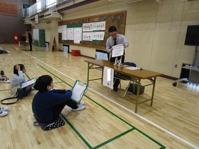 6年生、キャリア教育の学習で、外部講師の授業を体育館で2時間受けました。様々なワークを通して、グループや全体で交流し、「はたらく」ことの意味を考え、考えが広がったり、深まったりしました。授業の最初には「はたらくのはお金のため」「仕方がない」という意見から、授業の最後には「はたらくことは、自分のすきをひろげること」「はたらくことは、自分を信じてやり抜くこと」などの意見が出されました。