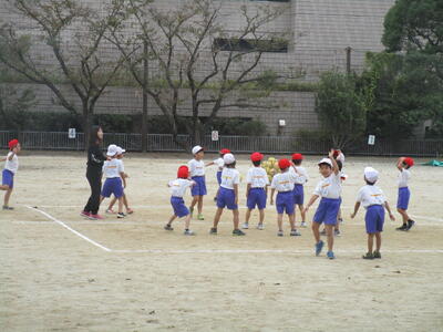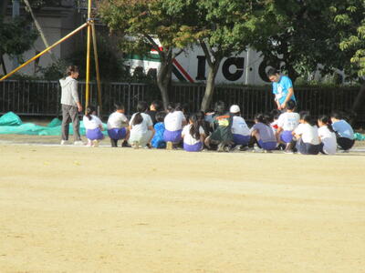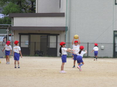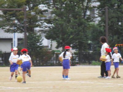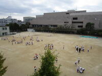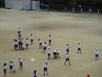 1年生、校庭で二つのコートに分かれて、ドッジボールをしていました。皆、とても楽しそうに、投げたりよけたりしていました。