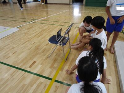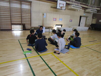 5年生、安定した倒立がどうやったらできるようになるか、子供たちが考え、技に挑戦していました。タブレットで動画を撮影して、自分の倒立の様子を見たり、友達に声がけしたり、お互いに切磋琢磨している様子が随所に見られました。