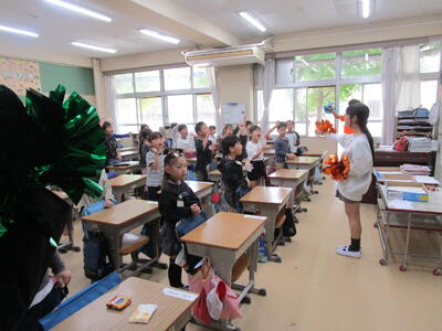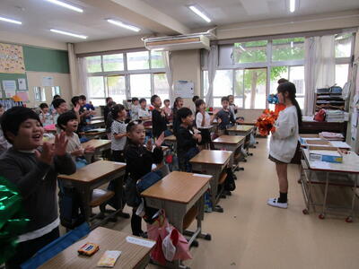 朝自習の時間に、金曜日に行われる陸上大会の壮行会が放送で行われました。その放送の前に、代表委員が中心となり、陸上部へのエールを手拍子と掛け声の練習を低学年の教室で行いました。1年生や2年生も、練習をしたので、大きな声で応援エールを送ることができました。