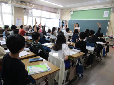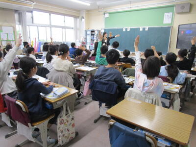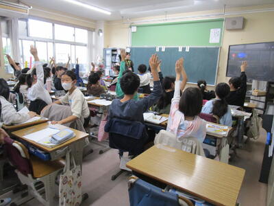 5年生、実習生の先生が算数で分数の大きさを比べる授業をやっていました。最初の問いに子供たち、とても積極的に手をあげています。