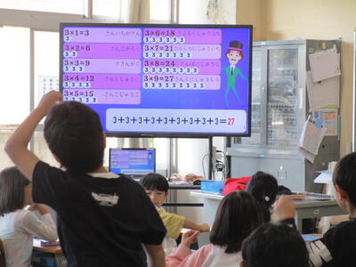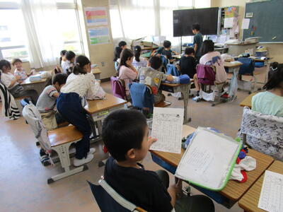 2年生、朝学習の時間にかけ算九九の練習をしていました。カードを見ながら友達同士で聞きあっているクラス、歌やリズムに合わせて唱えているクラスがありました。5年生は、その時間にタブレットでタイピング練習をしているクラスがありました。とてもタイピングが速くて驚きました。積み重ねが大切なんですね。