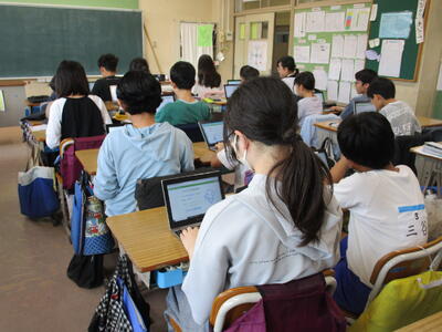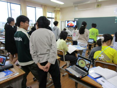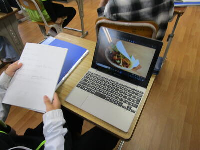6年生、英語で、自分の好きな食べ物や物が世界の国のどの国とつながっているのか、調べて、英語で発表していました。「タコス」「オムレツ」「マカロン」など食べ物を選んでいる子がとても多かったです。