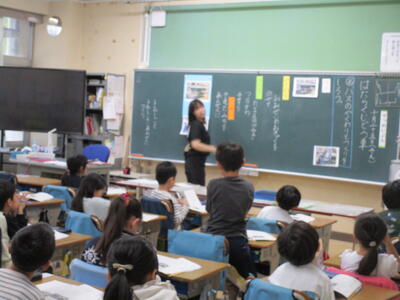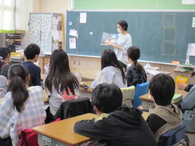 6年生、英語の学習で、「ジャガイモは、北海道産です」「タコはモロッコ産です」など、産地を英語で伝える学習に取り組んでいました。
