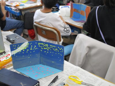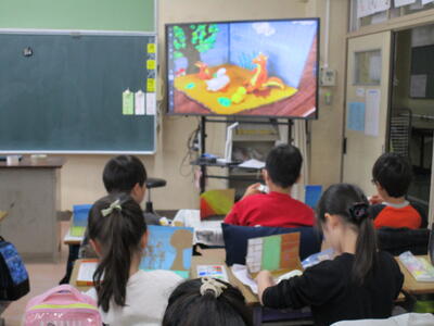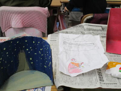 4年生、自分の好きなお話の世界を紙粘土で作って表現しています。先生がお手本で作ったのは「きつねのおきゃくさま」です。子供たちに聞くと「銀河鉄道の夜」や竜の出てくる話など、それぞれの子が設計図をもとに粘土をこねていました。