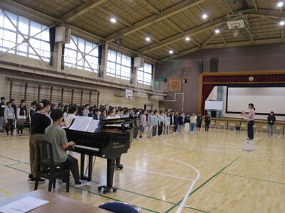 6年生、市内音楽会があるので、他の学年より一足早く、体育館での学年練習が始まりました。