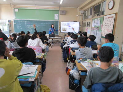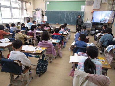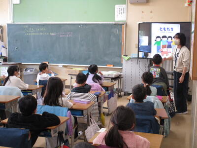 朝学習の時間に放送で教頭先生から、千葉県の小中学校で行う学校生活アンケートについての説明がありました。その後、県から送られてきた5分ほどの説明動画を全クラスでみました。1年生の教室に行ってみると、動画をしっかりとみていました。