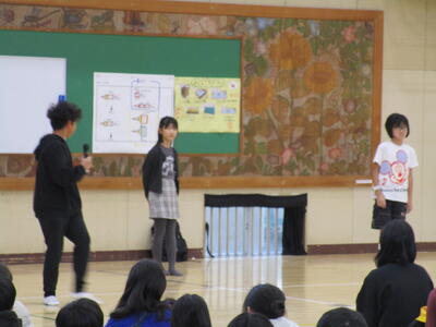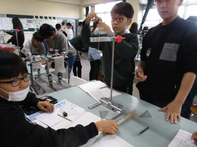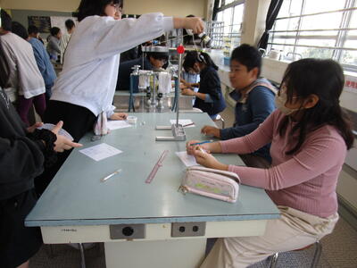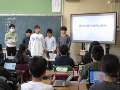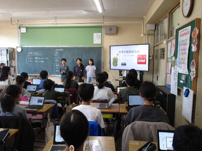 5年生、理科室で振り子長さを変えて、時間が変わるか実験をしているクラス。総合的な学習で、「地球を救え!」をテーマに分かれて、グループで発表をしているクラスがありました。貧困や地球温暖化など、パワーポイントでしっかりと資料が作られていました。