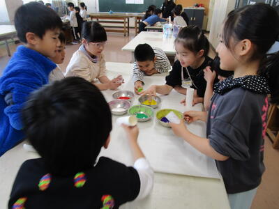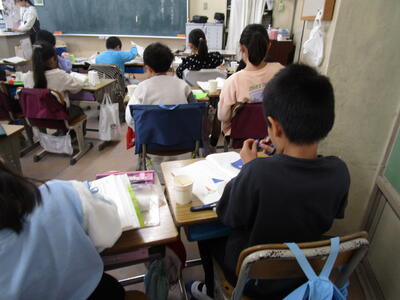 1年生、図工室で「ともだちとたのしくスタンプあそびをしよう」を目標に、大きな紙にグループの皆と協力して、自分でもってきたもので、スタンプをしていました。2年生は、教室で図工「いろいろもよう」でティッシュペーパーを2回折って、カラーペンで模様を描いて広げる活動をしていました。集中して、模様づくりをしていました。