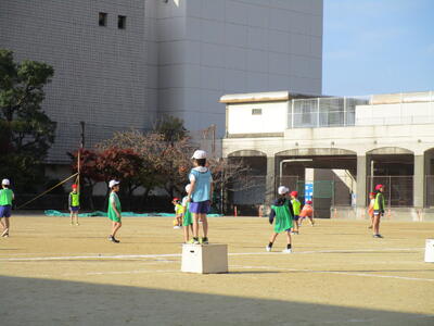 2年生と4年生、ペア学年のペアクラスで、朝から大繩跳びの練習をしていました。その後、4年生のまた別のクラスが高跳びの練習のため、準備運動をていねいにやっていました。