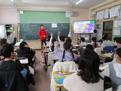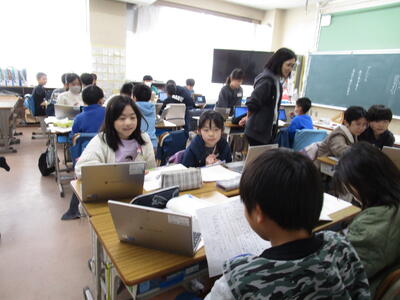 4年生社会、昔の印旛沼の洪水をどうすれば防げるのか、当時の地図を見ながら、子供たちが予想をしていました。6年生も同じく社会、明治維新の時のいろいろな人々の思いを予想しながら学習していました。ノートのまとめ方がとても工夫されていました。