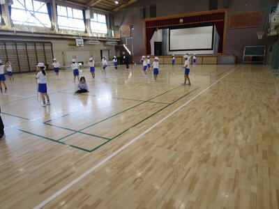 1年生が体育館で、体育の授業で、縄跳びの練習をしていました。前跳びや後ろ跳び、交差跳びを練習している子もいました。3年生は、校庭で、まずは縄跳びの練習をして、その後、グループごとに分かれて、ポートボールのパスやシュートの練習をしていました。