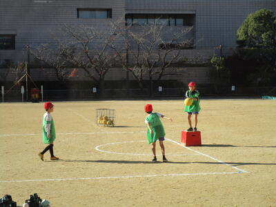 3年生、校庭でポートボールのパスやシュートの練習をチームで協力してやっていました。