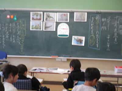 3年生、国語「モチモチの木」で、「物語のはじめと終わりで、豆太はかわったと思うか」自分の考えとその理由を話し合う学習するところです。黒板には今までの学習の流れと、皆が描いたモチモチの木が・・・。学習を始める雰囲気がとてもいいですね。