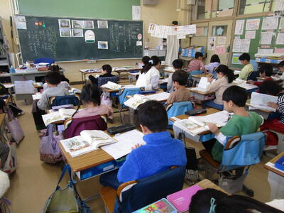 4年生、国語「クラス図鑑をつくろう」で、「黒板がなぜ緑なのか」「空はなぜ青いのか」など疑問に思ったことを調べて、文章にまとめていました。読んでいる人に伝わるように、写真や図を使って工夫をしていました。