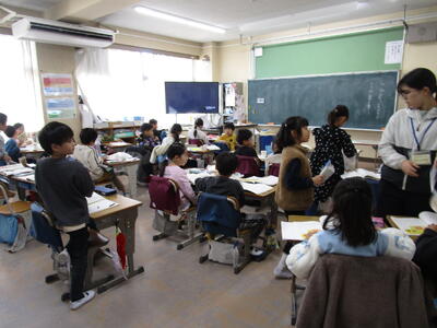 1年生、国語で「スイミーにお手紙を書こう」の学習に取り組んでいました。また、教室にドアにクラスの子供たちが折り紙で作ったサンタさんが掲示されているクラスもありました。サンタさんの顔が皆にこにこしていて、見ているこちらもうれしくなりました。
