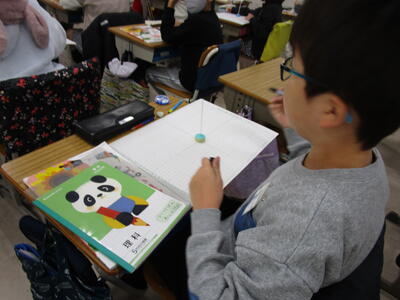 2年生、生活科で自分が選んだおもちゃ作りをしていました。「糸電話」「ぴょんぴょんがえる」などなど、子供たちは夢中になって作ったり、遊んだりしていました。