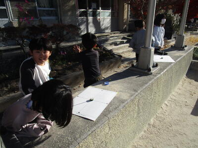 3年生、理科の学習で、太陽の動きを調べるのに、影の動きを調べる実験に取り組んでいました。雲一つない、晴天の日なので、今日は実験にぴったりの日です。