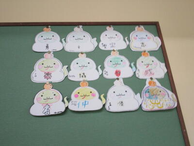 1年生、節分に向けて、自分の中にあるどんな鬼(わるいこと)をなくしたいかを、鬼の口の中に書いていました。「ねぼうおに」「ぐうたらおに」など、自分のかえたいところをそれぞれの子供が書いていました。