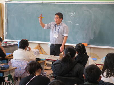 4年生、習字の時間に今までの学習を振り返り、その学習を生かしての選択教材です。左右の組み立て方「木材」か上下の組み立て方「岩山」のどちらかの文字を自分で選んで書きます。子供たちは「土地」と「竹笛」を学習したので「うまくできなかった方を選ぶといいのではないか」と意見を言っていました。