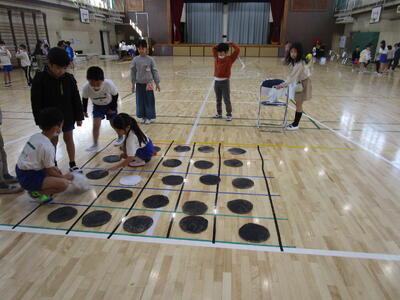 1.2年4組合同、体育館で「おもちゃランド」をやりました。2年生が作ったおもちゃランドに1年生を招待しました。2年生が国語・生活科の学習で作った説明書をもとにやり方を説明し、おもちゃで1年生が遊びます。「ほかけ車」「巨大オセロ」「ジェットカー」「糸電話」「ぴょんぴょんがえる」「ドキドキビー玉迷路」など、多くのおもちゃがあり、1年生はとても楽しく遊んでいました。看板を作ったり、参加した1年生に認定証や記録証を出したり様々な工夫がありました。